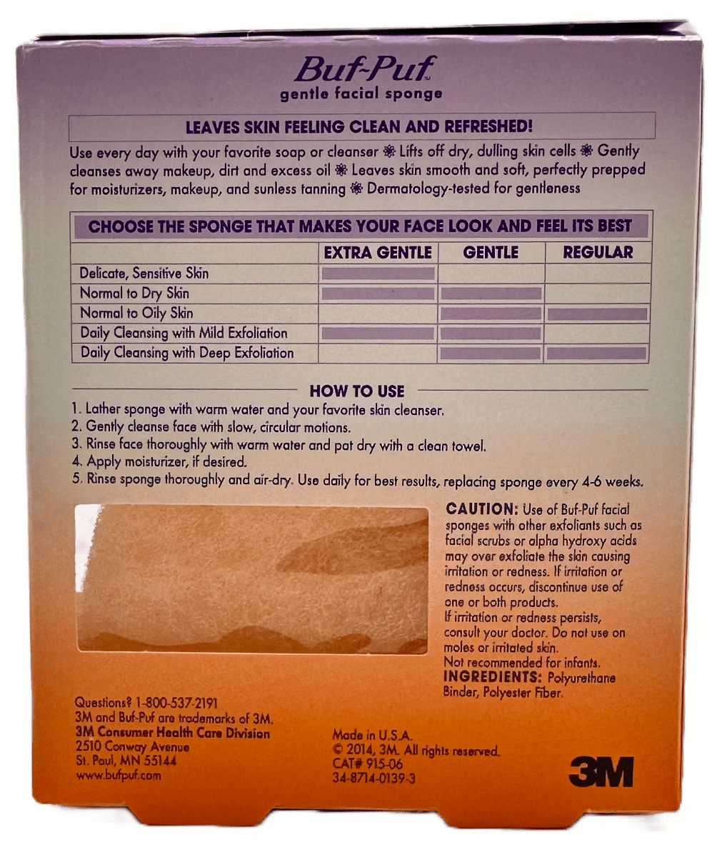 - Use of Buf-Puf facial sponges with other exfoliants such as facial scrubs or alpha hydroxy acids may over exfoliate the skin causing imitation or redness.