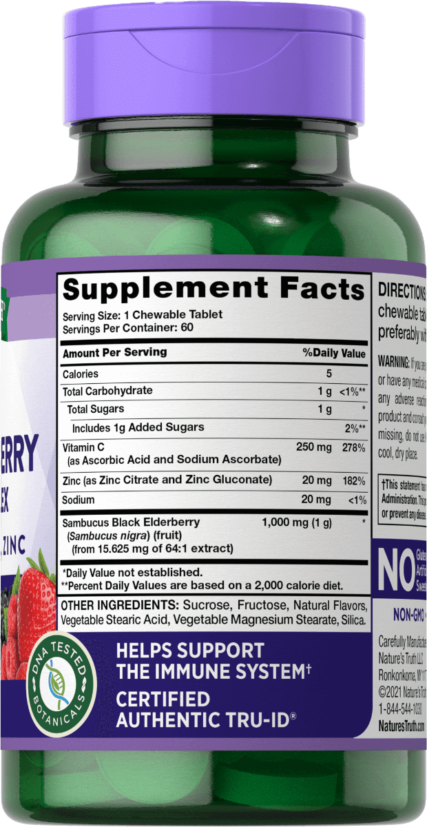 Nature's Truth - Sambucus Black Elderberry Immune Complex Plus Vitamin C, Zinc Chewable Tablets - Natural Mixed Berry Flavor - 60 Ct